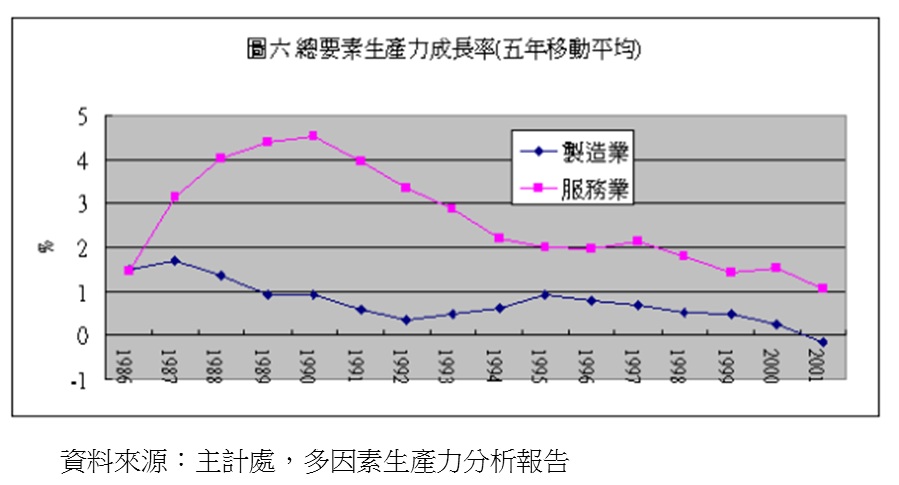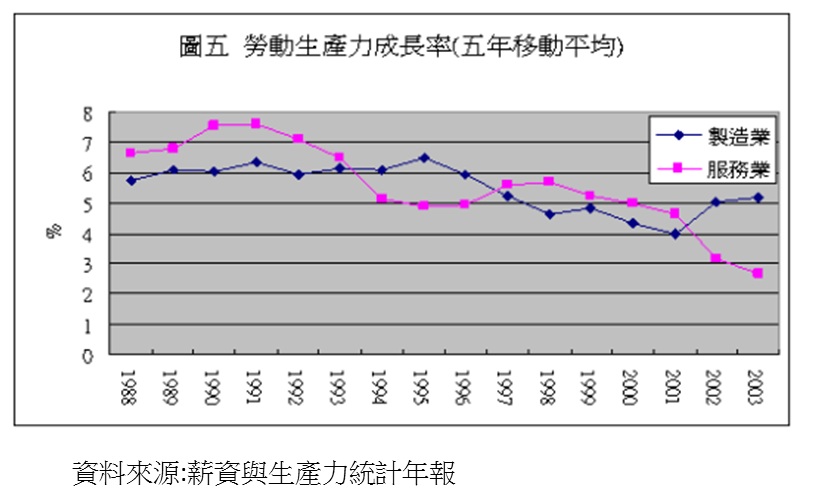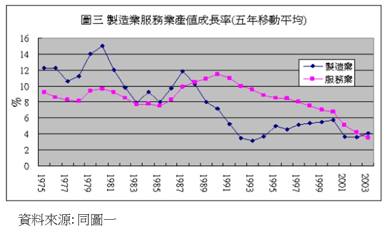 但自1987年以後,製造業的成長率開始大幅下滑,服務業也呈現先升後降的情形。服務業五年平均成長率在1988年開始突破10%,在1990達到11.48%的高點。自此服務業的成長即呈現穩定下滑的趨勢,一直到2003年,其五年平均成長率甚至低於製造業。這說明了這幾年服務業比重大幅提昇,不是因為服務業大幅成長所致,而是因為在製造業與服務業成長幅度同時減緩時,服務業的減緩幅度小於製造業。然而,自1993年起,兩者間的差距已逐漸拉近,製造業成長幅度逐漸回升,而服務業卻是加速下滑,以致於在2003年出現服務業成長不如製造業的情形。因此,以近五年的成長率觀之,服務業的表現已落後製造業。