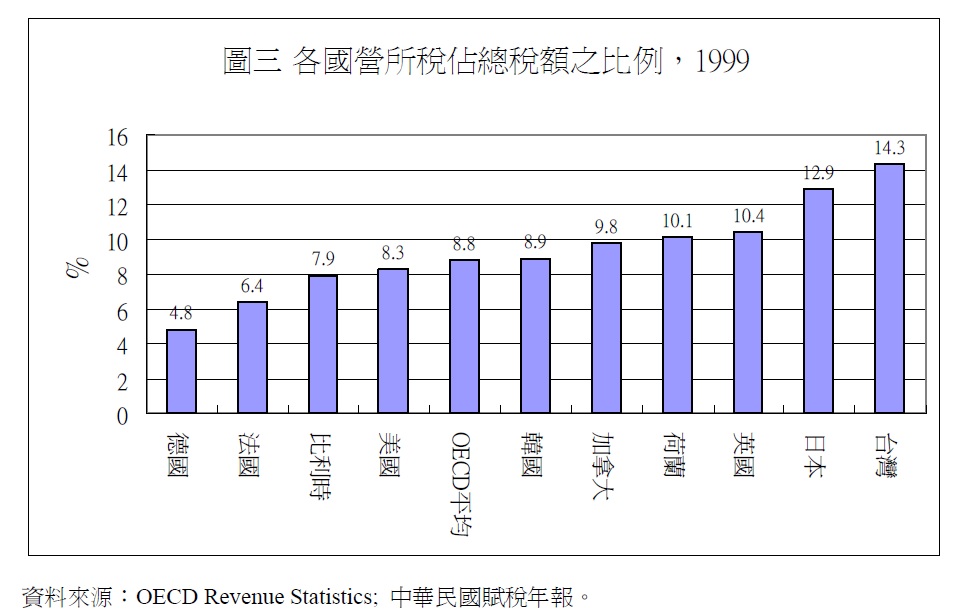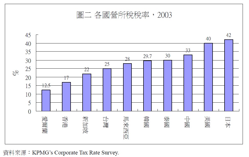 圖二為各國營所稅稅率之比較,台灣的營所稅稅率在國際間並不算高。在所選的主要國家中,只有愛爾蘭、香港與新加坡低於我國。然而,我們由變動的趨勢來看,台灣的25%的稅率已維持多年未曾改變,而此時,其他國家卻紛紛調降稅率,使得台灣與其他國家的稅率差異越來越小。例如台灣與OECD的稅率,在1996年相差約13%,但在2003年,則縮小為不到6%。同時,若針對真正與我國有投資上競爭關係的國家,例如新加坡、中國、香港、韓國,台灣稅率高於新加坡與香港,與稅率高於我國的韓國與中國的差異也正在逐漸接近當中。
