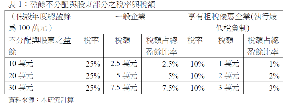 此處我們可以看出一個矛盾的地方。對享有租稅優惠的企業實施最低稅負制,目的是要讓這些企業在享有租稅優惠的同時亦能盡最低的納稅義務而繳交最低限額的稅。雖然這些企業繳納一定的最低稅負,其仍然是享有租稅優惠的企業,所繳稅額仍需比一般企業為低,如此方不失租稅優惠與最低稅負的本意。但是由表一中我們可以看出,如果一般企業不分配股東之盈餘為10萬元,而享有租稅優惠的企業為30萬,則享有租稅優惠的企業需比一般企業多繳5千元的賦稅。也就是說,在實施10%的最低稅負後,在不分配盈餘差距高於某一比例下,享有租稅優惠的企業其不分配與股東盈餘之稅負會高於一般企業,而在更多的情形下,它們會相去無多。兩稅合一已使享有租稅優惠的企業喪失實質的租稅減免,實施最低稅負制更加使這種情形的嚴重性擴大,使享有租稅減免的企業不但沒有享受到減免,反而需付出更多的稅。