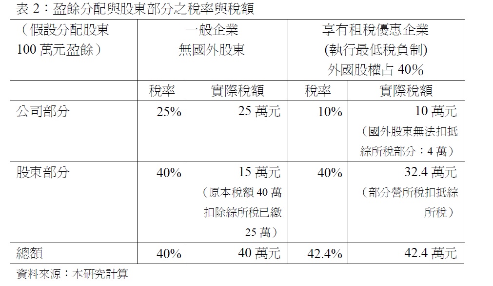 以上為盈餘不分配給股東的部分。在盈餘分配與股東的部分,在最低稅負實施後一樣會出現享有租稅減免的企業需付更多的稅的情形,而且情況可能更為嚴重。