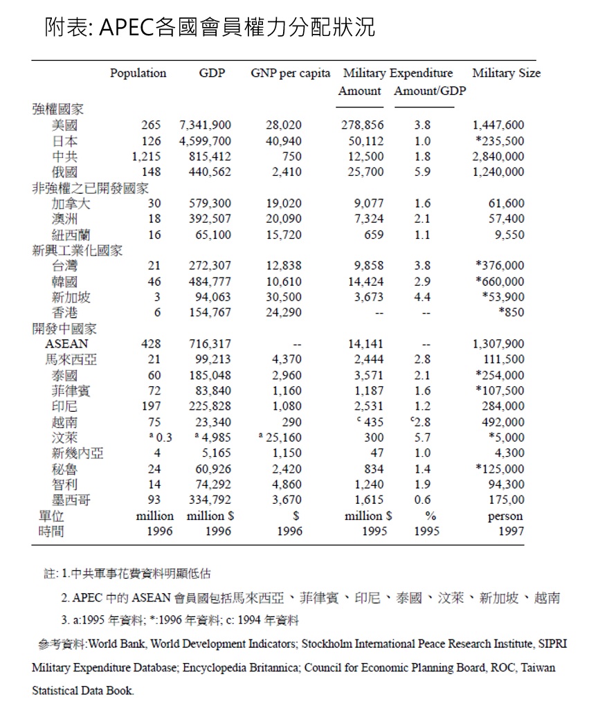 要採用國際權力結構作為分析的工具首先必須瞭解各國權力分配狀況。一個國家的國力約略為軍事能力與經濟能力的總和。附表顯示,在APEC會員國中,可稱得上強權國家的有美、日、中、俄四國。美國擁有全球第一的GDP產值,數目最高的軍事花費,為後冷戰時期最具權力基礎的國家。日本GDP產值緊追美國之後,同時也有為數不小的軍事預算及相當的軍事力量。中共是一個興起中的強權國家,以其眾多的人口,逐年快速增加的GDP產值(若加上香港則GDP值更大),可預期的,在亞洲事務上所扮演的角色將日益加重。表中中共的軍事花費為官方公佈的資料,明顯的少於實際花費,有一項美國的估計甚至認為,中共每年軍事花費最高可達2000億美元(The Washington Times, Jun 22, 2000, A12)。至於俄羅斯之所以仍被視為強權是因為其仍具有相當的軍事力量。但是俄羅斯現專注於內部改革,無暇顧及太多歐洲以外的國際事務,且為APEC新加入的會員國,對APEC事務涉入不深,因而本文將不視其為APEC政治議題的主要行為者。