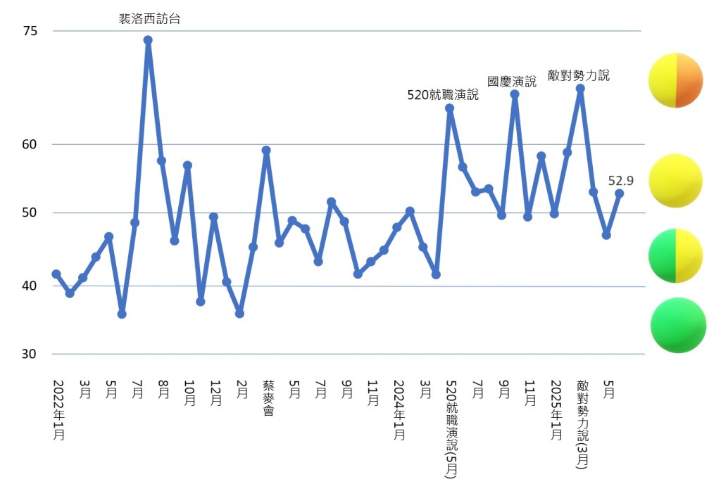本月兩岸衝突較上月上升,但幅度不大。焦點在於中共對賴清德總統「團結十講」的反應展現克制,主要是因為大罷免選舉將至,為避免引發國內反中情緒,所展現的短暫收斂。儘管如此,本月解放軍仍在台海舉行4場聯合戰備警巡。其中6月26日的戰備警巡屬於四面環台等級,而且就在「團結十講」第二講之後。此外,本月解放軍兩艘航空母艦遼寧艦和山東艦首次同時在西太平洋活動,位置甚至已抵近第二島鏈。美日等國本月亦舉行5場軍演。本期以四面環台等級的戰備警巡為基準,選擇6月20日-26日為觀測期,期間衝突分數由上期的47.5上升至52.9,燈號由綠黃燈上升為需要警戒的黃燈。