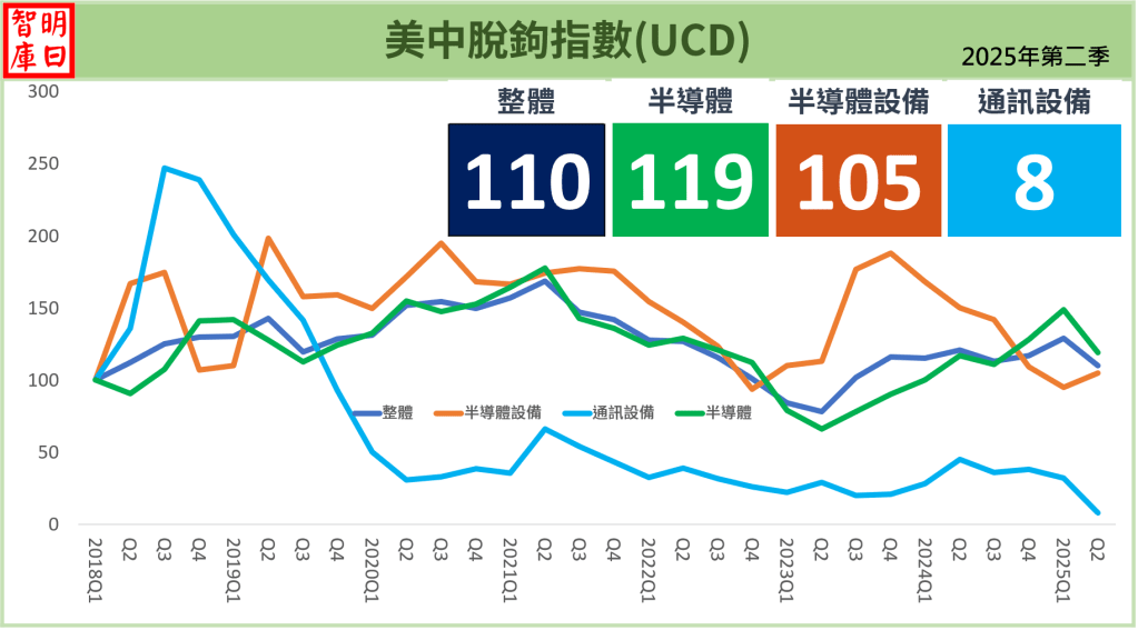 上圖顯示2025年第二季三大領域指數與整體指數,及自2018年以來的歷史資料。指數越小表示脫鉤程度越大,零代表完全脫鉤。2025年第二季,在四項指數中,僅半導體設備指數上漲,其餘均下跌,表示美中在半導體設備的脫鉤程度較上季減少,其他領域則增加。半導體設備在上季跌落100以下後,本季又反轉超越,而半導體與整體指數同樣維持超過100,表示以上三大領域不但未脫鉤,反而較2018年第一季兩國連結程度更深。在四項指數中,以通訊設備脫鉤的程度最大,指數僅為8,不但遠低於基準指數(100),同時也較上季大幅下滑。半導體仍是脫鉤程度最小的領域,本季指數雖然大幅下跌20%,達119,但仍維持在100以上。半導體設備指數為連續五季下跌後的首次上漲,漲幅10.5%,指數來到105。在整體指數方面,本季受到半導體指數下滑影響,指數由上季的129下跌至110,整體而言,本季兩國脫鉤程度雖增加,但仍處於未脫鉤的狀態。