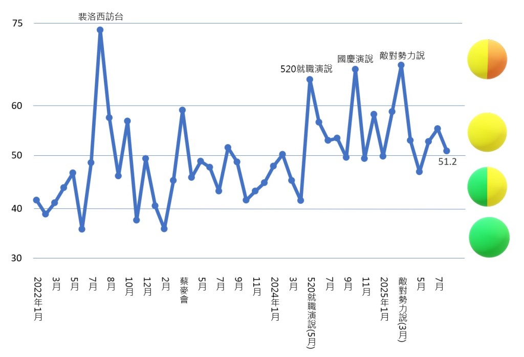 本月兩岸衝突指數較上月下滑。除了經濟層面維持不變外,在軍事、文攻層面的衝突均減緩。本月中共僅舉行兩場威脅性低的戰備警巡,原本衝突可以更大幅度下降,但卻因為解放軍在廣東汕尾舉行一場結合大批滾裝輪的「軍民融合」登陸演習,針對性十分明顯,因而加劇兩岸衝突。除了上述三項演習外,本月解放軍在南海舉行一場實彈射擊,並與俄羅斯進行「海上聯合-2025」演習。本月美國與其盟國在西太平洋地區亦舉行4場軍演。本期以解放軍23日所舉行「軍民融合」登陸演習為基準,選擇8月21日-27日為觀測期,期間衝突分數由上期的55.2下降至51.2,燈號仍為需要警戒的黃燈。