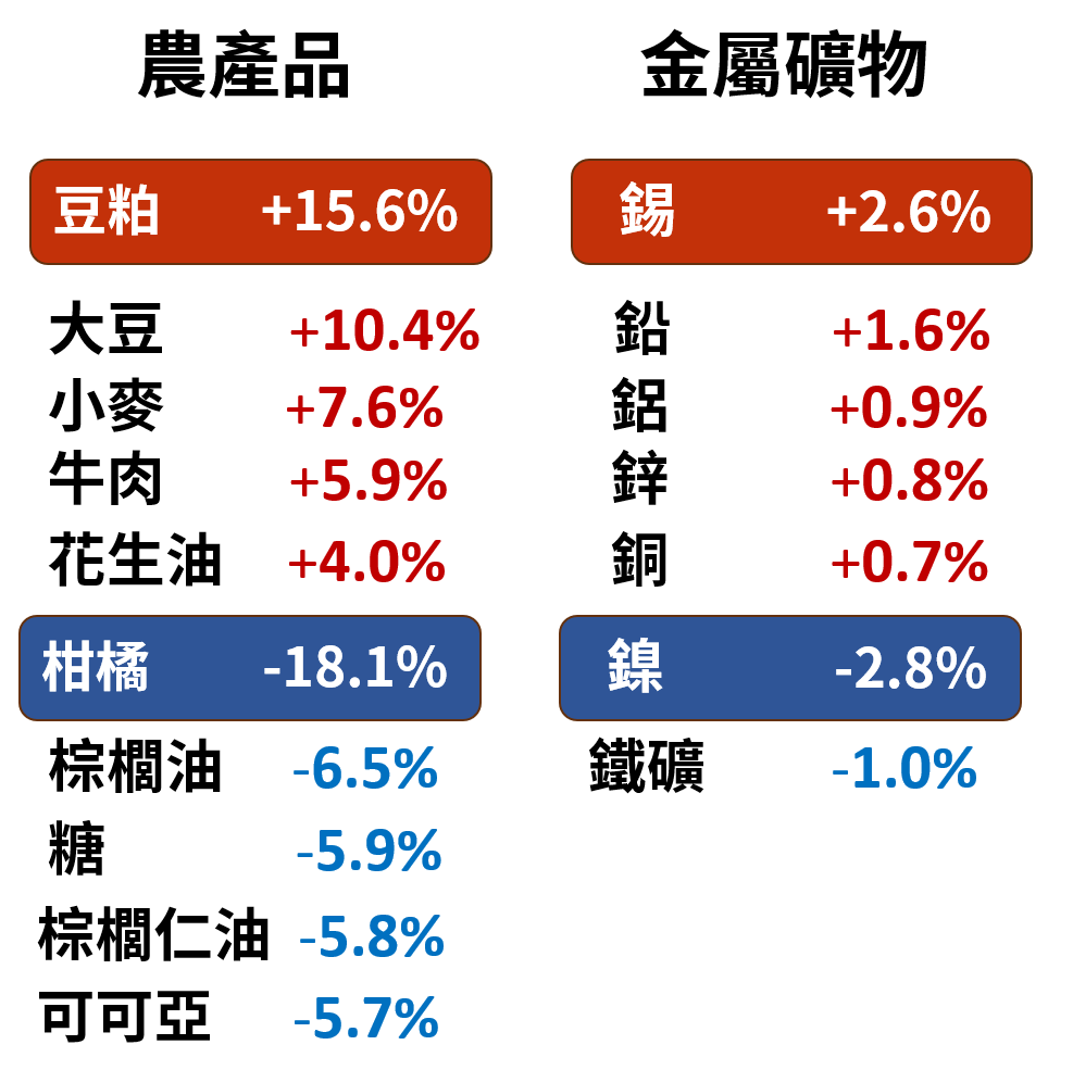 - 下跌品項:以柑橘幅度最大,達 18.1%;其次為棕櫚油 (6.5%)、糖 (5.9%)、棕櫚仁油 (5.8%)、可可亞 (5.7%)。