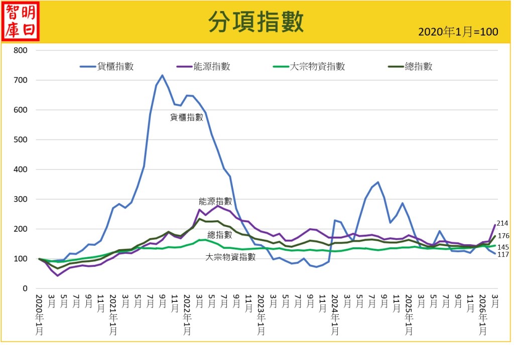 | 總指數 | 176 | 149 | +18.1% | 能源暴漲帶動年增率轉正,終結長達一年的通縮慣性。 |