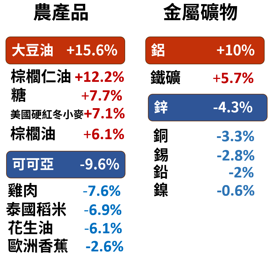 - 下跌品項:可可亞(-9.6%)、雞肉(-7.6%)、泰國稻米(-6.9%)