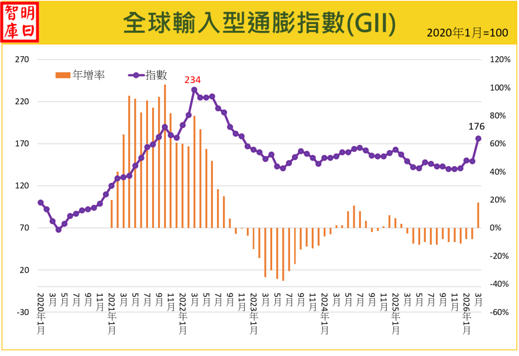 2026 年 3 月 GII 指數大幅上升 18.1%,指數達 176,明顯高於上月的 149。三大類指數中,除貨櫃運價下跌外,其餘項目全面上揚。能源價格受美伊衝突造成荷莫茲海峽封鎖影響,單月暴漲 34.6%,其中石油價格漲幅更超過四成。非能源大宗物資亦在肥料與農產品帶動下走升。本月年增率在連續 12 個月負成長後首度轉正,且幅度陡升至 18%,顯示全球物價邏輯正處於極為敏感的動態轉折點。